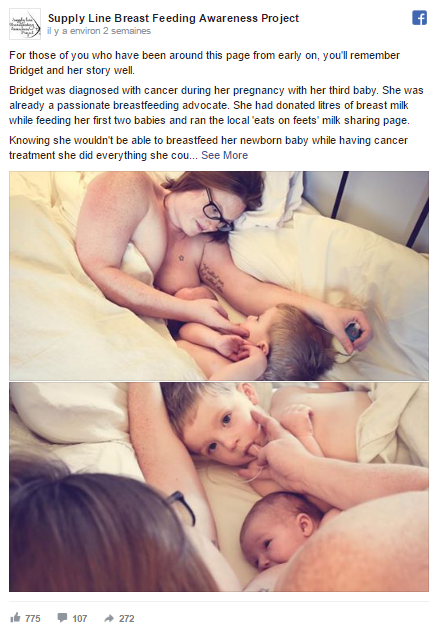 L’alimentation au doigt consiste à alimenter bébé avec le tube coincé sur un doigt. Cette méthode, bien que relativement inconnue, n’est pas si rare. Elle est utilisée lorsqu’un nouveau-né a du mal à téter. Bridget, quant à elle, a fini par nourrir son fils ainsi sur le long terme, les autres options ne lui convenant pas. « Avec l’alimentation au doigt, nous pouvions avoir un lien privilégié. » Elle ajoute : « Grâce au contact du peau à peau couplé à l’alimentation au doigt, cela a provoqué chez moi une libération d’ocytocine qui nous a aidé mon fils et moi à nous lier, car je n’avais pas pu prendre soin de lui quand il n’était encore qu’un nouveau-né « . Bridget explique qu’elle a finalement nourri Rowan pendant 2 ans et demi de cette façon (avec son propre lait maternel une fois ses traitements contre le cancer terminés). C’est pour faire connaitre cette pratique au plus grand nombre que Bridget a partagé son expérience sur la page Facebook intitulée « Supply Line Breast Feeding Awareness Project ». D’ailleurs, la publication est rapidement devenue virale comptabilisant plusieurs centaines de « j’aime ».