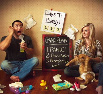 Papa panique, bébé va arriver, faut s’entraîner sur le chat, au secours, allô ! Elle est marrante cette annonce de grossesse ?