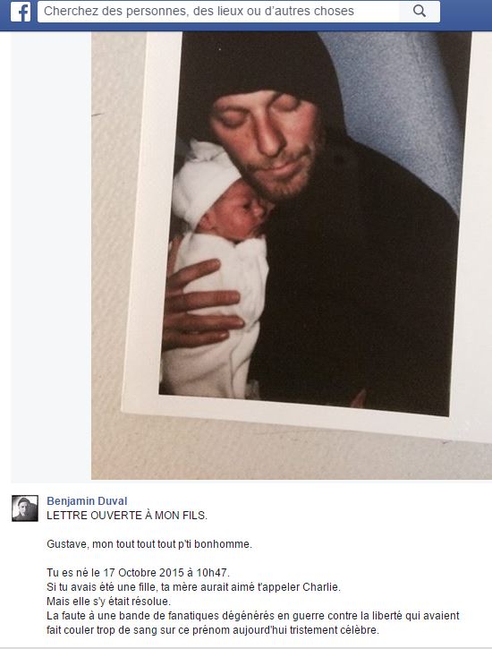 Suite aux terribles attentats survenus le 13 novembre 2015 à Paris, un jeune papa a décidé de publier une lettre ouverte à son fils Gustave, âgé à peine d’un mois. Cette lettre bouleversante a ému la Toile et a été partagée plus de 200 000 fois sur Facebook. Avec beaucoup d’humilité, de tristesse de courage et d’espoir, Benjamin Duval décrit ses émotions et pose les mots qu’il aurait voulu dire à son fils, né le 17 octobre 2015.