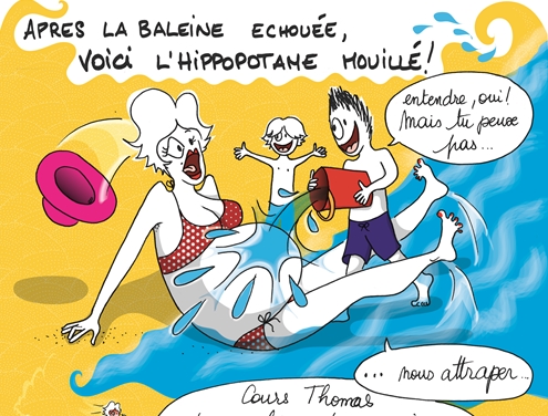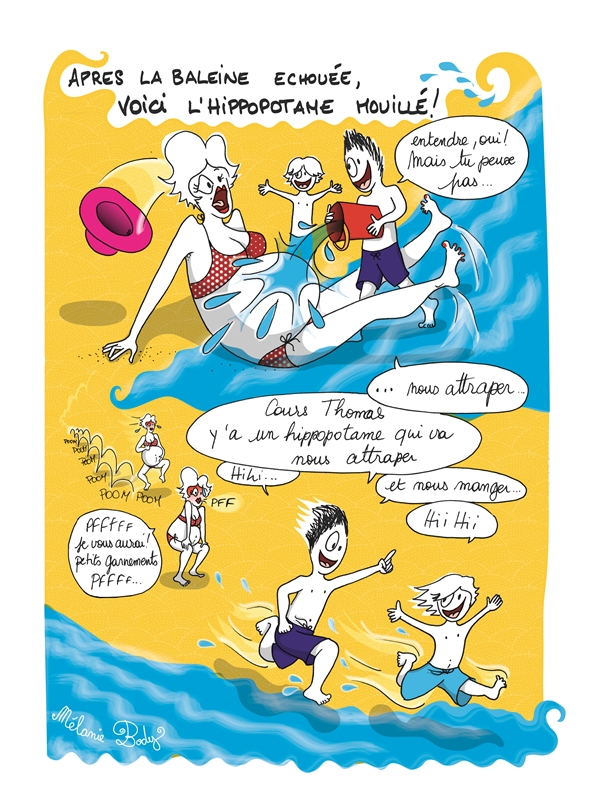 Ah que vous êtes bien, allongée sur la plage, les doux rayons caressant votre visage (bien protégé et armé de crème solaire) … C’était sans compter vos petits garnements, qui ont décidé de jouer et qui n’ont rien trouvé de mieux que de vous arroser, tel « un hippopotame » d’après eux (ne les écoutez pas surtout). Et pas moyen de leur courir après, vous êtes ralentie par le poids de bébé !