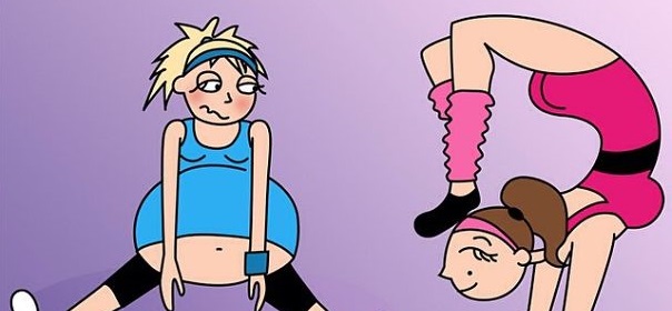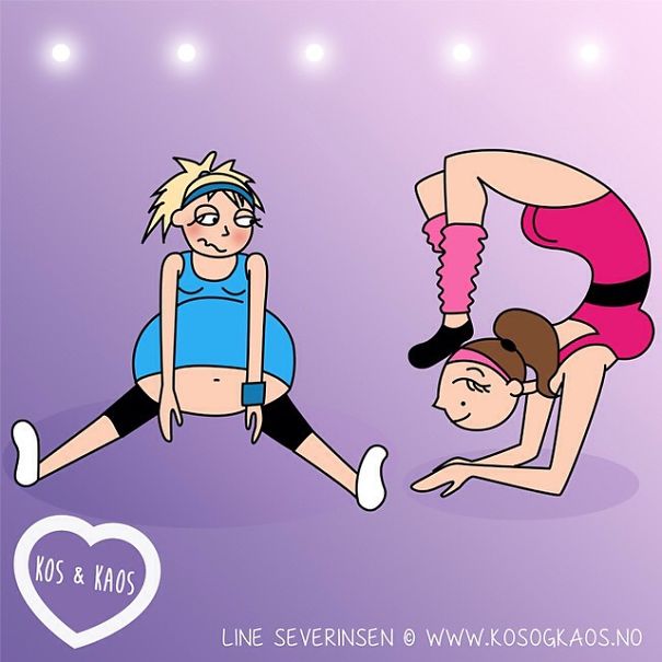 Vous vous êtes toujours dit que même enceinte : pas question d’arrêter le sport, mais en effet, ce n’est plus possible… Alors oui au début ce n’était pas compliqué, le bidou était (beaucoup) moins gros, mais là il est bien plus gros et vous avez du mal à jouer de votre souplesse… Et en plus on vous nargue ! L’illustratrice Line Severinsen, nous illustre bien tout cela non ?