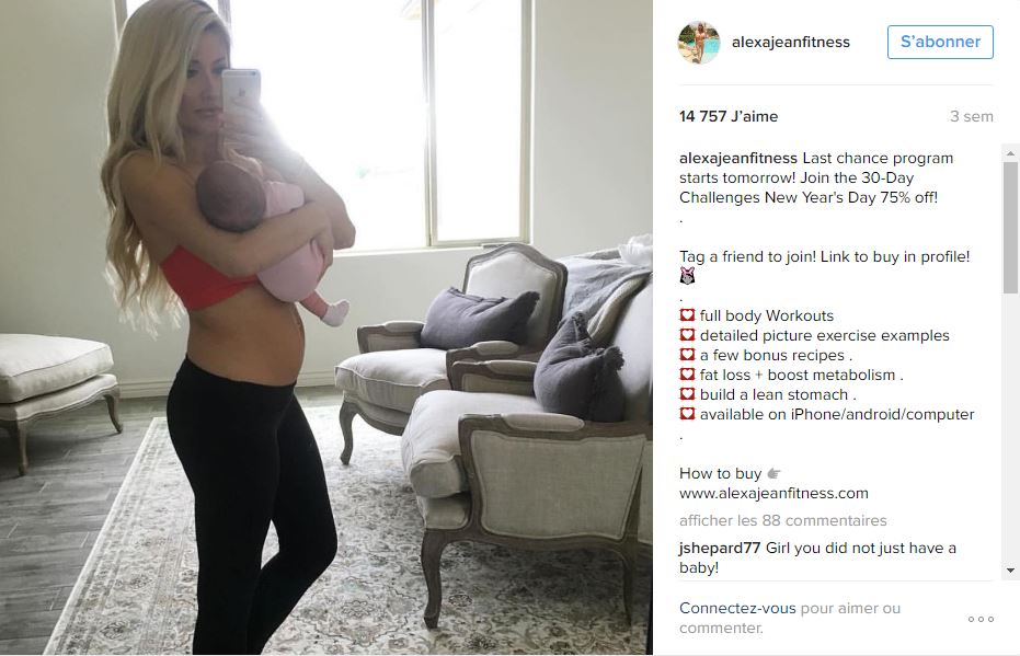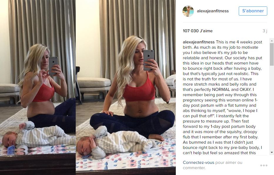 En voyant les photos de blogueuses fitness après leur grossesse, la pression pour retrouver la ligne après avoir mis au monde notre petit bout peut parfois s’avérer stressante pour nous, les mamans. Avant toute chose, il faut savoir que ces filles ont fait de leur passion pour le sport un métier. Elles ont donc tout le loisir de l’exercer quand elles veulent. De plus, sur les réseaux sociaux, les images partagées sont choisies. Elles ne sont donc pas le véritable reflet de la réalité. Avec ses 2 millions d’abonnés, Alexa Jean fait partie de ces blogueuses fitness. Néanmoins, elle a décidé de montrer la réalité de son corps post-accouchement sur Instagram. Cette maman de deux petits bouts en avait juste assez des fausses images et voulait partager des clichés inspirants à sa communauté.
