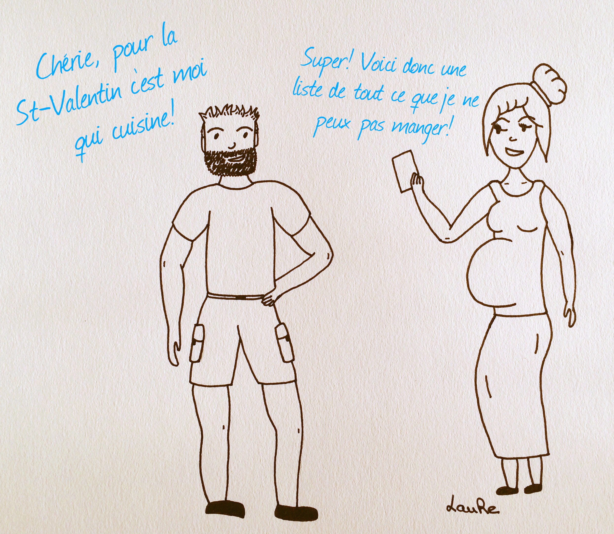 Chouette, c’est bientôt la Saint-Valentin. Au programme, vous prévoyez  un repas en amoureux à la maison. Et cette année, en bonus, c’est l’amoureux qui cuisine. Il va pouvoir se décarcasser avec la liste des aliments qui te sont interdits depuis que tu es enceinte. Bon courage et bon défi chéri !