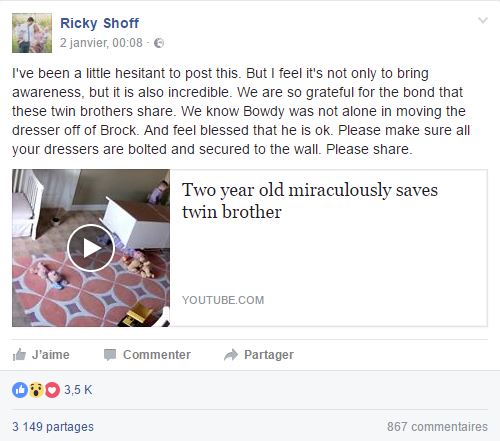 La force dont ce petit bout a fait preuve a déjà fait le tour du web, et pour cause, à seulement deux ans, il sauve son frère jumeau coincé sous une commode. Postée sur Facebook le 2 janvier par leur papa Rick Shoff, la vidéo enregistrée par une caméra de surveillance a déjà été vue plus de 3 500 fois sur le réseau social. On y voit deux petits garçons qui jouent dans leur chambre et qui tentent de grimper dans les tiroirs ouverts de leur commode. Sauf que le meuble succombe sous leur poids et le petit Brock Shoff se retrouve immobilisé en dessous. Son frère, Bowdy, a eu l’incroyable intuition qu’il devait le sauver.