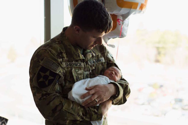 L’été dernier, le Sergent Zach Shryock et sa femme Brittany ont appris qu’ils attendaient leur premier enfant. Malheureusement, le soldat a été envoyé en Afghanistan peu de temps après. Et il ne serait de retour à Atlanta, où vit le couple, qu’un mois après la date prévue pour l’accouchement de Brittany. Mais un changement de dernière minute lui a permis d’apprendre qu’il faisait partie des quelques soldats qui rentreraient chez eux plus tôt que prévu, date prévue autour de la Saint-Valentin. Zach aurait donc finalement la possibilité d’être présent pour préparer la venue au monde de leur bébé. Pourtant, la petite Myra, trop pressée de rencontrer son papa sur le chemin du retour, a complètement changé le plan initialement prévu.