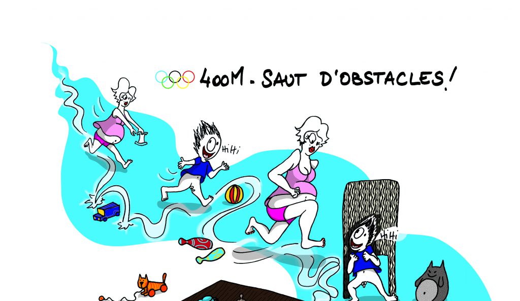 Être enceinte, c’est du sport. Mais le plus dur pour l’instant, c’est notre autre petit monstre qui court et saute partout, tel un athlète aux Jeux Olympiques ! Forcément, quand on réussit à l’attraper, on a l’impression de mériter la médaille d’or de la future maman la plus en forme ! Mais ce n’est pas fini, il faut changer sa couche maintenant … Place à l’épreuve de lutte à présent !