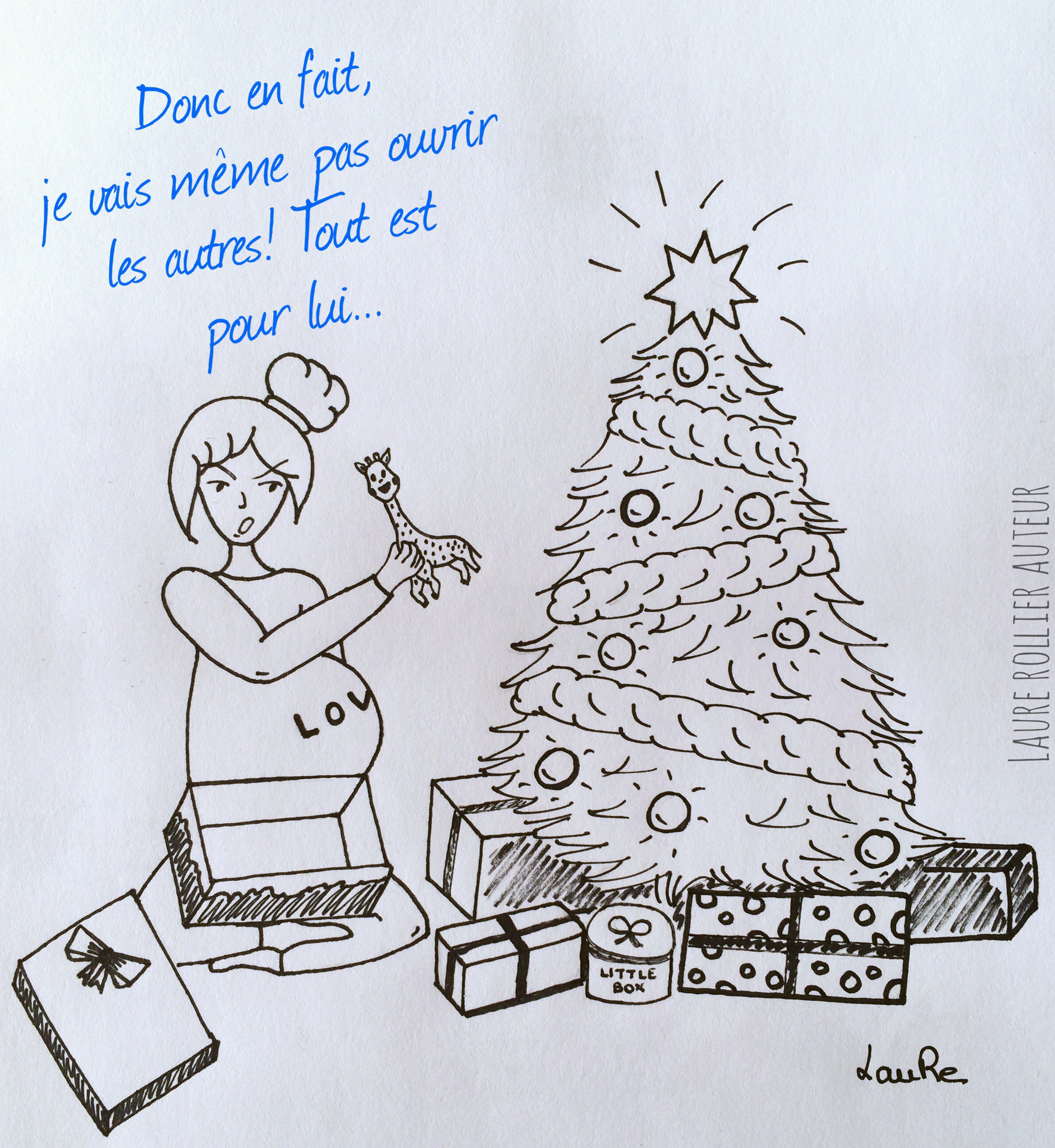 Youpie, le moment que tu attends le plus à Noël est enfin arrivé, c’est l’heure du déballage des cadeaux ! Et comme chaque année, depuis que tu es enfant, tu adores te jeter sous le sapin pour y découvrir ce que le Père Noël a déposé. Tu ouvres le premier et, oh surprise, c’est un jouet pour bébé, et un autre, et encore un autre… Oh une peluche ! Euh, pourtant c’est bien mon premier qu’il y a écrit sur les paquets non ?