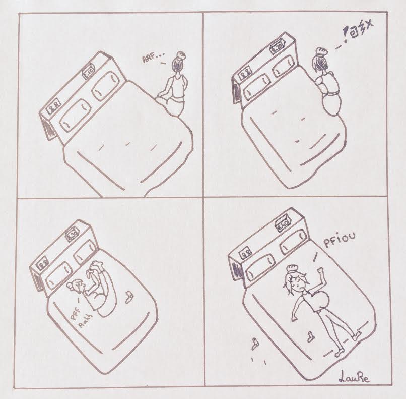Ce n’est pas toujours facile d’enlever ses chaussettes quand on est enceinte, encore plus vers la fin ! Bah oui, ce gros bidou a beau abriter notre petit bout d’amour, il est quand même bien encombrant ! Démonstration avec un dessin de Laure, illustratrice et créatrice du blog Les écrits de Laure.