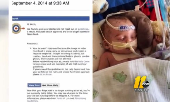 Les parents du petit ont alors sollicité les internautes via Facebook pour les sensibiliser au sujet des enfants ayant besoin d’un don d’organe et pouvoir payer les soins médicaux nécessaires. Le papa, Kevin Bond, a donc créé une page intitulée « Hudson’s heart » pour mobiliser les gens autour de son bout de chou. Mais le réseau social a censuré l’un des posts avec la photo du petit garçon… En cause ? Facebook trouverait le cliché « effrayant, sanglant ou sensationnel » parce que le petit est relié à des tubes. Pour le père du bébé interrogé par la chaîne de télé ABC, cette décision est très dure : «… J’ai un peu pleuré…. Que quelqu’un rejette une photo de mon fils magnifique, qui a besoin d’aide, allongé dans son lit d’hôpital – ça m’a estomaqué ».