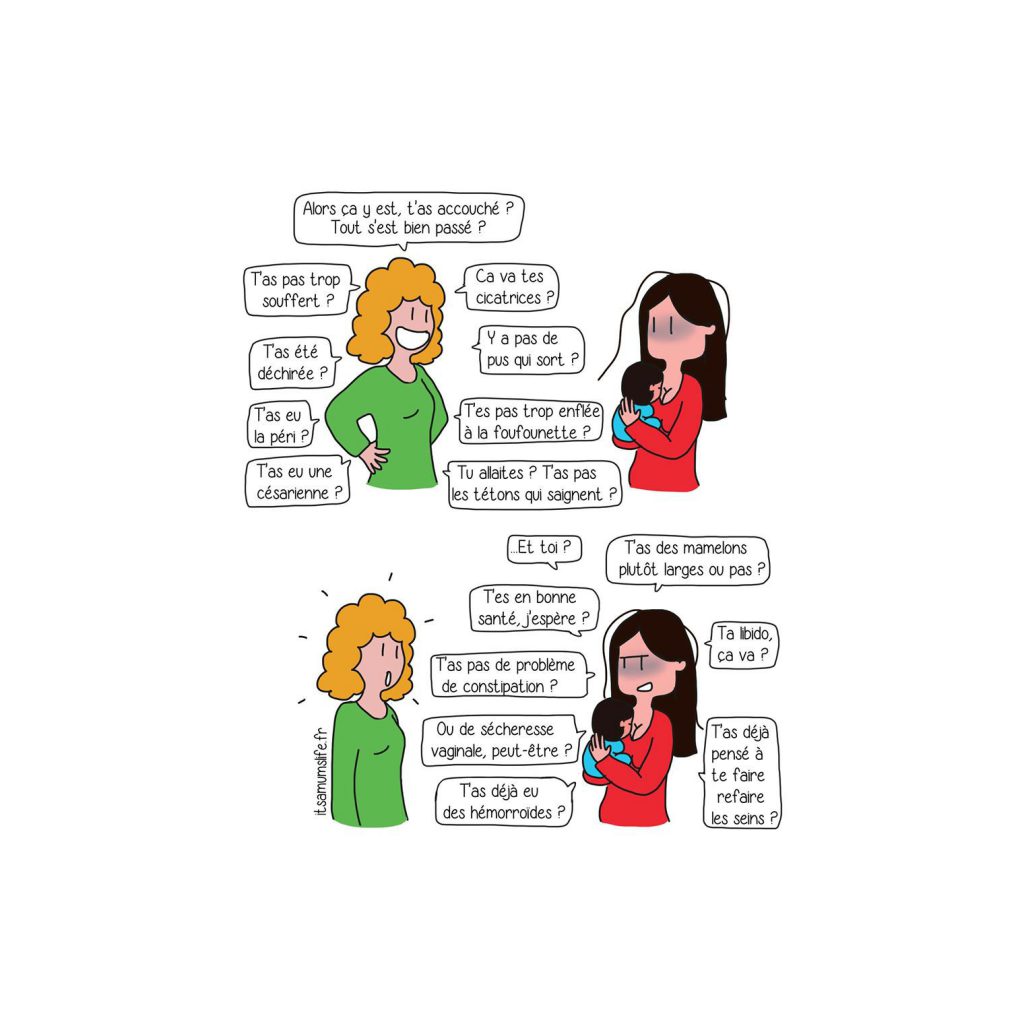 Dès que bébé est né, elles arrivent : les questions gênantes. Et les pires viennent souvent des copines déjà mamans… Elles sont déjà passées par l’accouchement, alors on a droit à toutes les questions et surtout celles auxquelles on n’a pas envie de répondre. Alors si on n’a pas envie de parler de l’état de nos seins, d’épisiotomie ou autres cicatrices, on ne se laisse pas faire et on riposte comme l’illustratrice Héloïse Weiner !