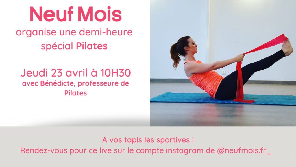 Un cours de pilates en direct sur le compte Instagram de Neuf Mois, ça sera jeudi 23 avril à 10h30. Oui, pour se défouler un peu à la maison et avec l’autorisation de votre médecin, si il n’y a pas de contre-indication pour vous, on vous propose de nous rejoindre sur votre tapis pour profiter d’un cours de pilates avec notre professeure Bénédicte.