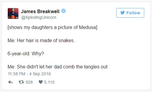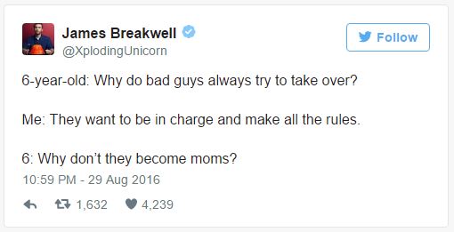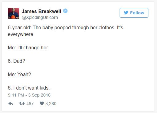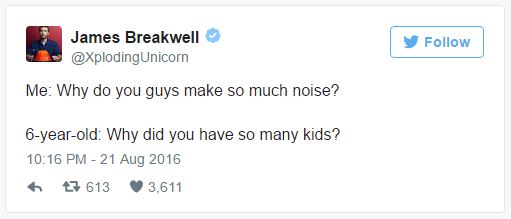 La raison du succès de ce papa sur Twitter ? Elle tient probablement au fait qu’il nous rappelle à tous la vie de parent, de ce qu’elle a de plus drôle. Être père pour James Breakwell, c’est un peu comme retourner en enfance et cela le ravit. Un jour peut-être, il se plaît à penser qu’il pourrait quitter son travail de bureau pour écrire à plein temps. La seule chose dont il est certain c’est qu’il devra travailler dur pour y arriver et en vivre. Il consacre déjà beaucoup de temps à alimenter les réseaux sociaux comme Twitter, Facebook, Instagram et Snapchat. Et, pour le moment, cela lui convient car il peut le faire sans se soucier de l’argent puisqu’il a un « vrai » job à côté. Et puis ces journées sont bien remplies, il travaille sur l’écriture de son premier livre « Only Dead on the Inside ». Il y apprend de manière amusante comment élever des enfants heureux, en bonne santé dans un monde envahi par les morts-vivants.