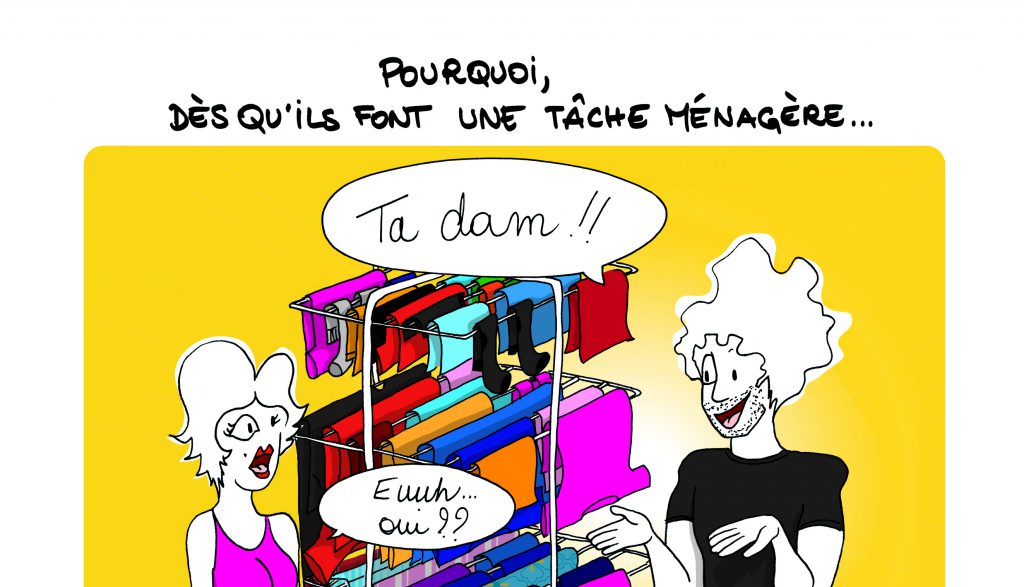Quand tu es enceinte jusqu’au cou, que tu as les jambes comme des poteaux, la tête comme une citrouille et le dos en charpie, tu peux heureusement compter sur l’Homme pour prendre ses responsabilités. Bientôt père de famille, il est prêt à te seconder efficacement. Et même à plier tes petites culottes ou à étendre une lessive, parce que l’Homme moderne ne craint plus les préjugés. En revanche, et parce que tout travail mérite salaire, l’Homme aime voir ses efforts reconnus : une petite médaille, un gros bisou, un commentaire encourageant (« bravo mon chéri, tu te débrouilles comme un chef !« ). Ne rechigne pas à lui offrir ces félicitations, et vois cela comme des travaux pratiques : tu seras prête à dégainer un sourire presque convaincant le jour où ton petit trésor t’offrira un énième collier de pâtes.