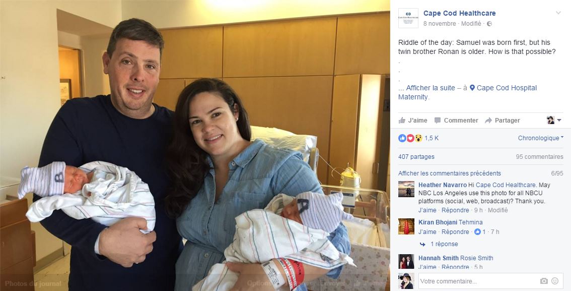 Fier de cette naissance pour le moins originale, l’hôpital de Cape Cod a partagé un cliché de la famille Peterson sur sa page Facebook. Et on peut dire qu’il a suscité beaucoup d’interrogation puisqu’elle a été commenté plus de 90 fois. Ce qui est sûr, c’est que ce type de naissance est assez exceptionnel pour être souligné.