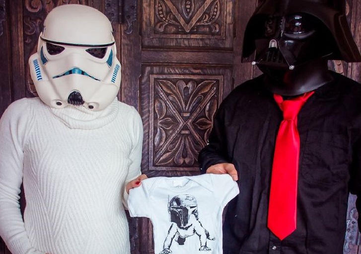 Pour tous les fans de Star Wars, voici une annonce de grossesse faite pour vous ! Si la force du jedi est avec vous, que vous connaissez par cœur les répliques de votre saga préférée et que vous ne sortez jamais sans votre masque de Dark Vador, alors c’est de cette façon que vous devez annoncer la venue de bébé. Ces futurs parents brandissent fièrement le body que va porter le petit : dans le même thème, bien sûr ! On espère que monsieur ne répétera pas sans cesse « je suis ton père »…