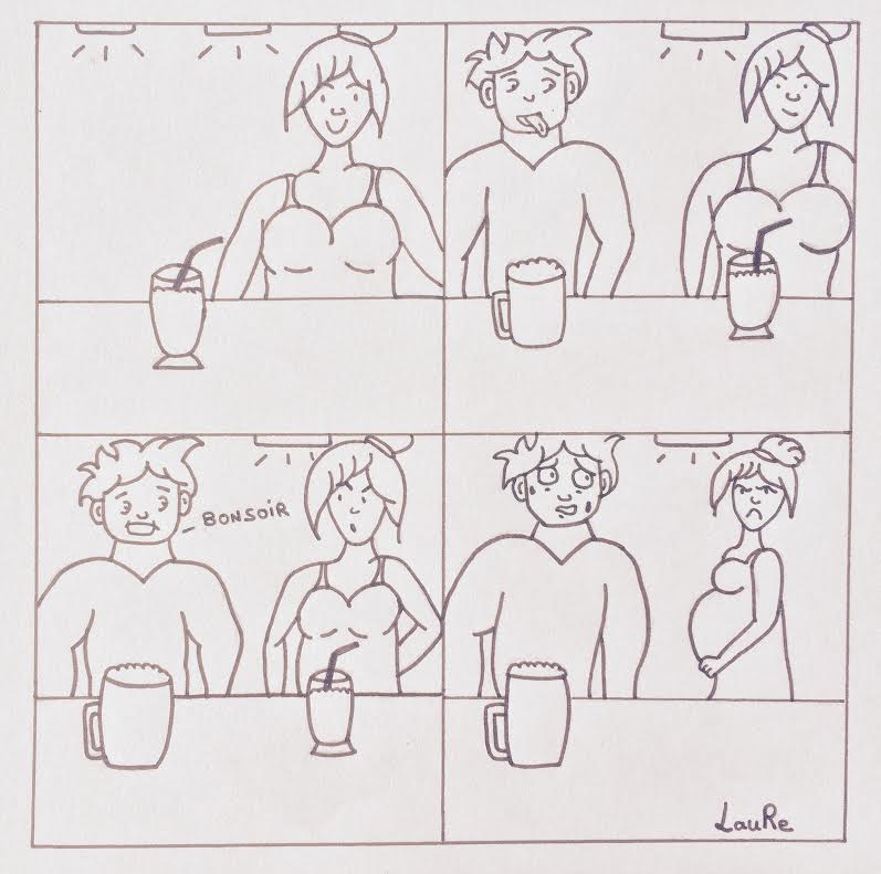 Rien de plus bizarre que de se faire draguer en étant enceinte ! Surtout quand le bel inconnu qui vous a abordé au café se rend enfin compte que votre ventre est bien arrondi…. Démonstration avec un dessin de Laure, illustratrice et créatrice du blog « Les écrits de Laure ». Amusant non ? Ça vous est déjà arrivé ?