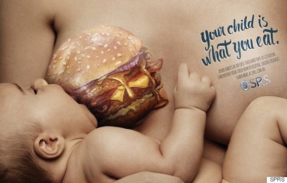 La société brésilienne de pédiatrie de Rio Grande, a lancé une campagne publicitaire mettant en scène des mamans en train d’allaiter, le tout avec de la nourriture peinte sur la poitrine. Le but ? Sensibiliser les futures mamans sur les effets des mauvais régimes alimentaires. Relayée par le Huffington Post, la campagne « Votre enfant est ce vous mangez » veut promouvoir à travers son message, une alimentation saine pour garantir une meilleure santé pour bébé.