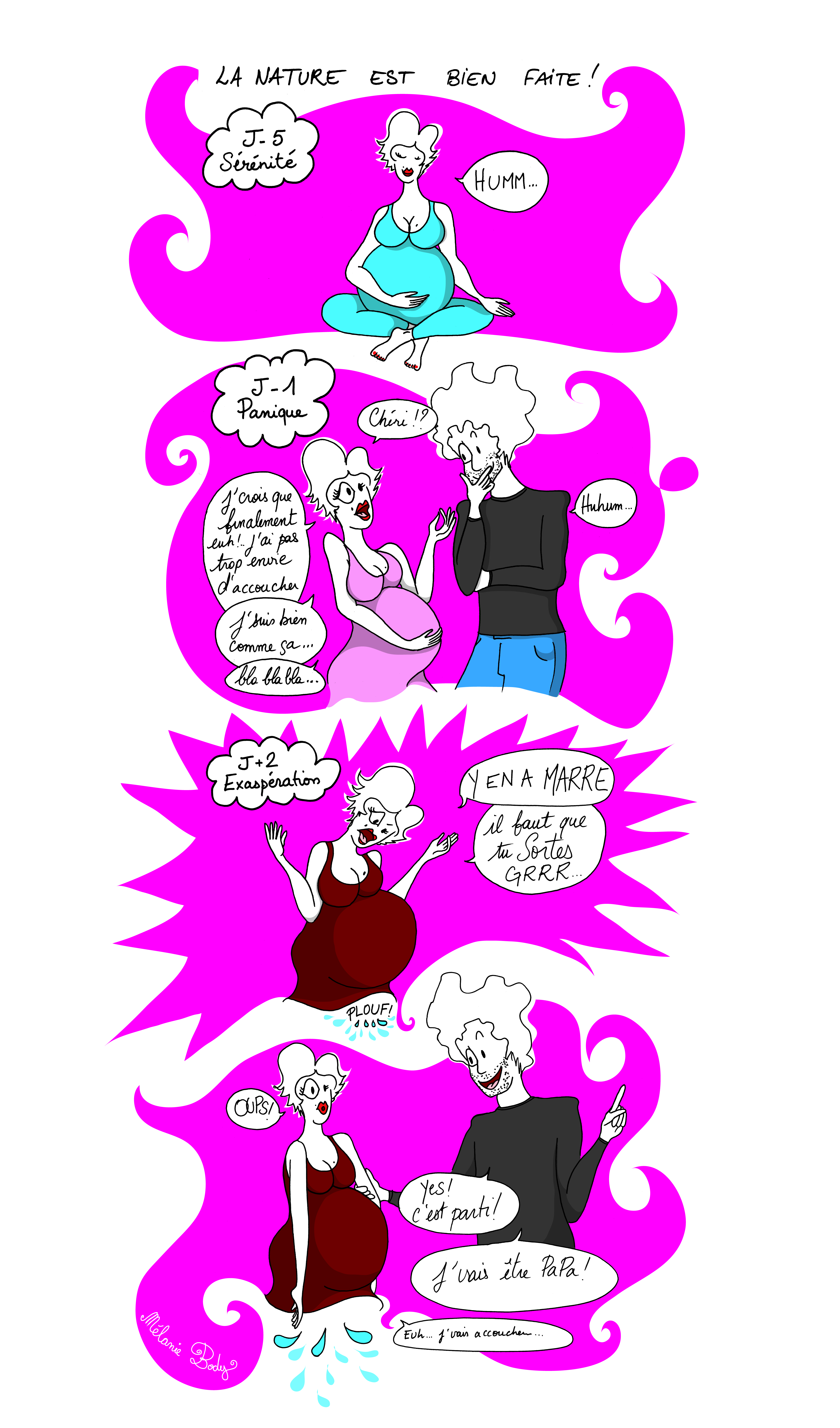 Aï, aïe, aïe, bébé sort on dépasse le terme là et finalement Bébé commence à pointer le bout de son nez… « La nature est bien faite ! » comme le dessine si bien Mélanie Body, auteure de la BD « Le Blog de Susie » !