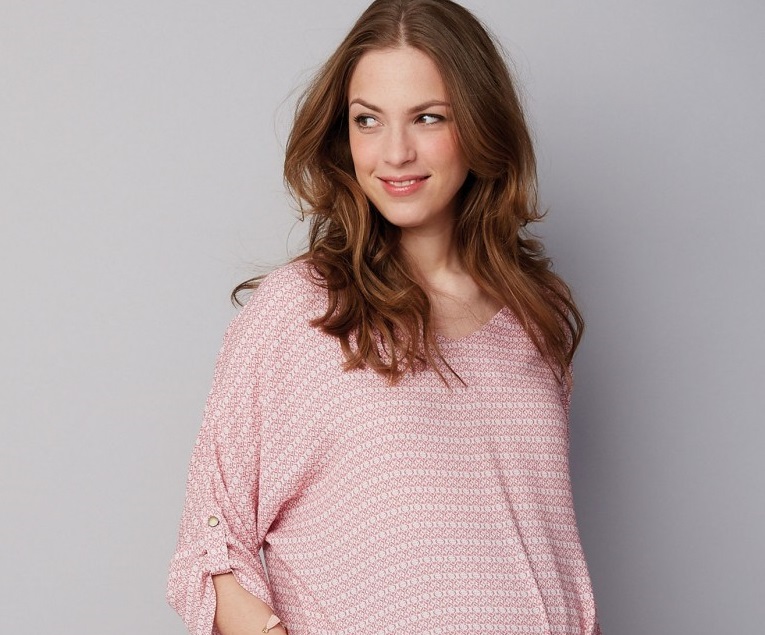 Vive la maille fluide et le rose qui ne joue pas au bonbon ! Haut de grossesse et d’allaitement, Belly Button, 65 euros