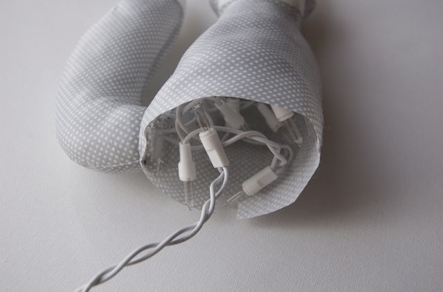Nous partons du principe que vous avez déjà la forme de votre lampe (ce tutoriel s’adressant à des novices en quête d’apprentissage manuel). Ici, nous avons choisi un petit renard. Remplissez de bourre votre animal afin de donner du volume à votre lampe. Rembourrez-la lentement, sans faire de gestes brusques. Ce serait dommage de l’abîmer avant même d’avoir commencé non ? Alors, prenez tout le temps nécessaire. Utilisez un crayon ou des aiguilles à tricoter pour la fin du rembourrage.