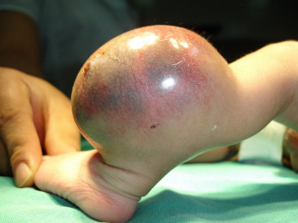 Généralement, durant son développement, la tumeur peut posséder plusieurs membres, de la peau, une cage thoracique, des intestins, une colonne vertébrale, des « organes génitaux externes » et des tissus cérébraux primitifs mais pas de crâne. Deux hypothèses existent quant au développement de cette tumeur : dans la première hypothèse, les fœtus peuvent être des jumeaux du bébé au développement incomplet qui pourraient être « intégrés » par ce dernier ; dans l’autre cas, la tumeur résulterait du développement anarchique de cellules embryonnaires. Cette lésion est presque toujours découverte avant la naissance, entre 4, 5 et 6 mois de grossesse (deuxième échographie). Dès que le diagnostic est fait, la maman est orientée vers une maternité de type 3 où elle sera suivie de très près jusqu’à l’accouchement.