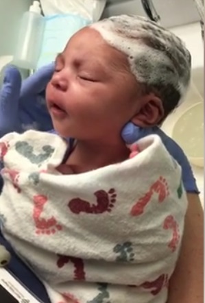 L’épreuve du tout premier bain et du premier shampoing est assez redoutée… Bébé va-t-il beaucoup pleurer face à ce moment encore inconnu ? Eh bien en ce qui concerne la petite Amira, c’était un instant parfait ! Regardez son air de béatitude tandis qu’elle se fait laver les cheveux par sa maman Taveon Glenn. On dirait nous chez le coiffeur pas vrai les amies ? Bon par contre on évite de mettre du savon dans les yeux de bébé si on ne veut pas l’entendre pleurer. Bah oui ça pique le savon nan mais oh ! Enfin plus trop, c’est vrai… Les fabricants ont fait des efforts pour supprimer le pique-pique, il faut bien le reconnaître. On leur donne un bon point, les amies ?