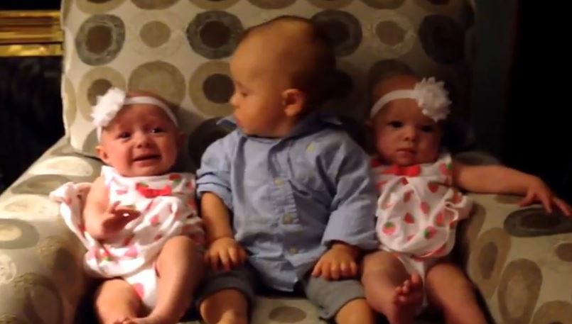 Pas facile de différencier des jumelles, surtout quand elles ne sont encore que des petits bébés ! C’est ce qu’expérimente ce garçon, Landon, encore bébé lui aussi mais plus âgé. Assis entre les deux petits bouts de chou le pauvre loulou a l’air complètement perdu ! Un coup d’œil à droite, un coup d’œil à gauche, est-ce que cette fillette se dédouble ? J’ai la même des deux côtés !Je suis perdu, help !