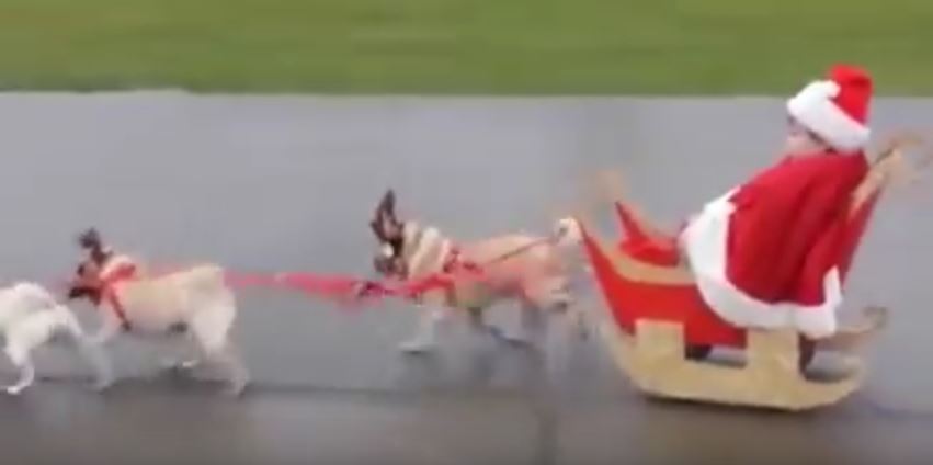 Vous entendez les filles ? Les cloches de son traîneau ? Et on voit Rudolphe au nez rouge en tête ! Oui c’est bien le Père Noël qui arrive !!!! Du coup, petite vidéo de circonstance avec ce bébé trop mignon qui se fait tirer en traîneau par ses chiens déguisés en rennes. On adore ! Pas vous ?