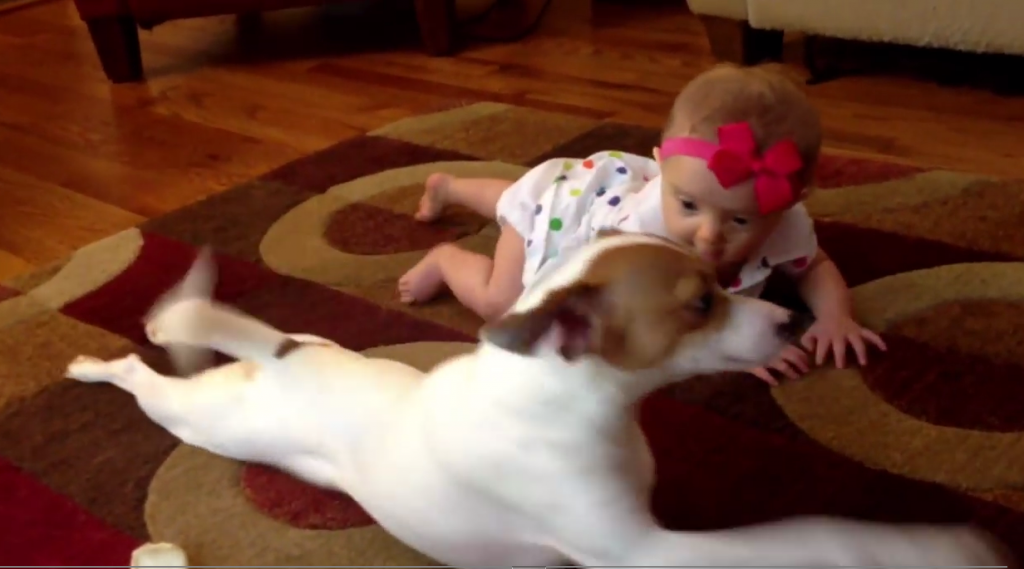 Vous avez sûrement déjà vu des vidéos de chiens qui aident leurs maîtres à protéger bébé ou encore à changer les couches du nourrisson (oui ça existe, c’est pas une blague) ? Mais avez-vous déjà vu un chien apprendre à un bout de chou comment on rampe ? Si si ! On vous promet ça aussi existe !