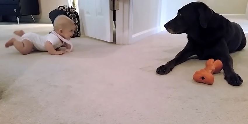 La petite puce (trop mimi au passage) que l’on voit est en train d’apprendre à ramper, et ça se passe sous les yeux attentifs du fidèle toutou de la famille. Attention, il surveille tout ! Il a peut-être peur que cet être qui se trémousse en rigolant devant lui pique son jouet préféré ? Pas de panique, les deux sont déjà complices : la vidéo s’achève par un geste trop mignon du chien !