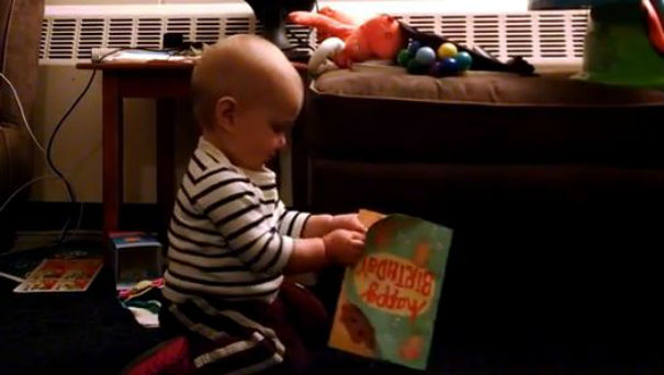 Les plaisirs les plus simples sont les meilleurs comme on dit ! Ce bout de chou de 1 an a reçu pour son anniversaire une carte sympa comme tout, qui joue de la musique quand on l’ouvre… (Moi je deviens dingue car une fois la mienne même fermée ne voulait plus s’arrêter, je vous jure ! Ce sont mes neveux à coté de moi qui s’en amusaient bien !). Et le moins que l’on puisse dire ici, c’est que le cadeau a fait très plaisir au petit bout ! Bébé danse et se déhanche au rythme de la musique, sans s’arrêter ! Et quand la carte lui tombe des mains, pas grave, il la reprend, la rouvre et recommence ! Trop mignon ce bambin avec la joie de vivre qu’il transmet et ça fait du bien !