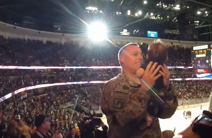 Sauf que tout de suite après, le Sergent est venu surprendre sa famille au milieu des gradins ! Leurs retrouvailles ont été transmises sur les écrans et le public était lui aussi fou de joie ! Étant déployé en Afghanistan, Robert n’avait pas vu sa femme depuis 10 mois, mais surtout n’avait encore jamais rencontré son nouveau-né : le public a donc assisté à un moment doublement émouvant !