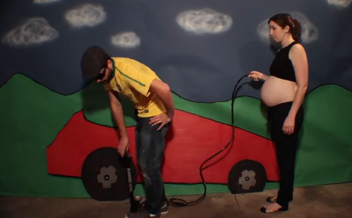 On voit la jeune femme assise dans une (fausse) voiture, qui crève un pneu sur la route. Un homme vient alors à sa rescousse, sauf qu’au lieu de regonfler le pneu… il gonfle le ventre de la conductrice ! Le montage est extrêmement bien réalisé, on imagine que cela a dû demander des heures de travail. Et devinez qui on peut voir à la fin de la vidéo ?