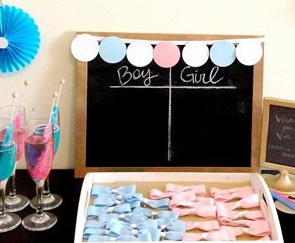 Proposez aux invités de porter un badge rose ou bleu pour montrer fièrement son clan.Team bleu ou rose ? Il faudra choisir son camp. Proposer aux deux équipes de s’affronter dans des petits jeux et de garder sa pancarte sur lui. Il devra la lever au moment du vote.Dans cette boîte, chaque invite glisse sa réponse et explique pourquoi il pense que bébé sera fille ou garçon. Les gagnants auront droit à un joli cadeau personnalisé : un coffret de biscuits d’antan, un paquet de bonbons roses ou bleus, un coffret de mini cupcakes. Les invités peuvent directement voter sur un tableau dans l’entrée. Offrez un cadeau à l’équipe qui gagne : un brunch organisé chez vous, un pique-nique aux beaux jours, ou donnez-leur un petit présent à chacun.Si vous pensez que bébé sera un garçon, portez la cravate et si c’est une fille, accrochez à votre veste un mini tutu.Les invités mangeront-ils du pop-corn rose ou bleu ? A côté des saladiers, créez une affiche sur laquelle les invités indiqueront ce qu’ils ont mangé.Faites s’affronter la team garçon et la team fille dans des jeux d’équipe. Vous pouvez faire cela en extérieur, dans un parc, en forêt…La team garçon portera un nœud papillon bleu et la team fille un nœud rose.