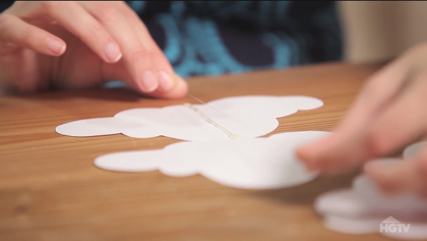 Puis collez délicatement le fil de nylon de la longueur de votre choix qui servira à faire tenir les nuages sur la structure en bois. Attention, votre fil doit être long car le but est de l’accrocher au plafond.