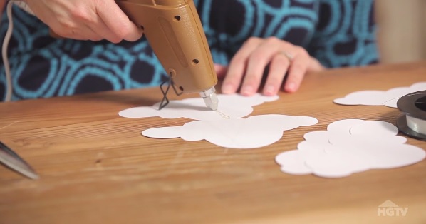 Commencez par imprimer les patrons ci-dessus en deux exemplaires chacun. Procédez ensuite au découpage des 10 nuages (4 gros, 6 petits). Prenez ensuite un grand nuage et appliquez de la colle glu au milieu.
