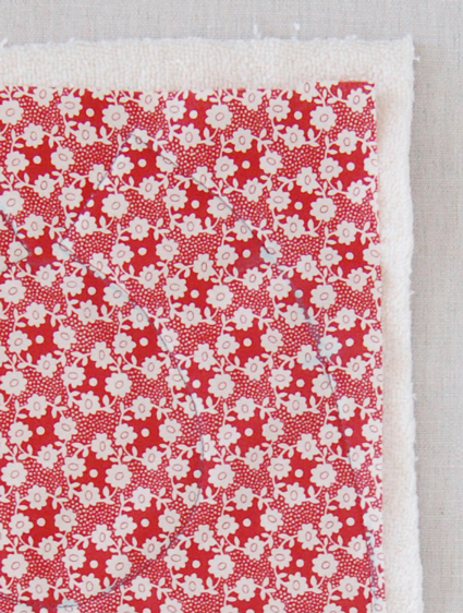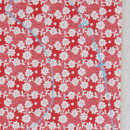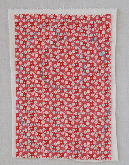 On trace au marqueur la forme d’un bavoir sur la serviette (ou le tee-shirt) et de même sur le tissu liberty. On superpose les deux tissus, et on fait deux marques en haut à droite du tracé. On coud tout le long de la ligne, sauf entre les deux marques !