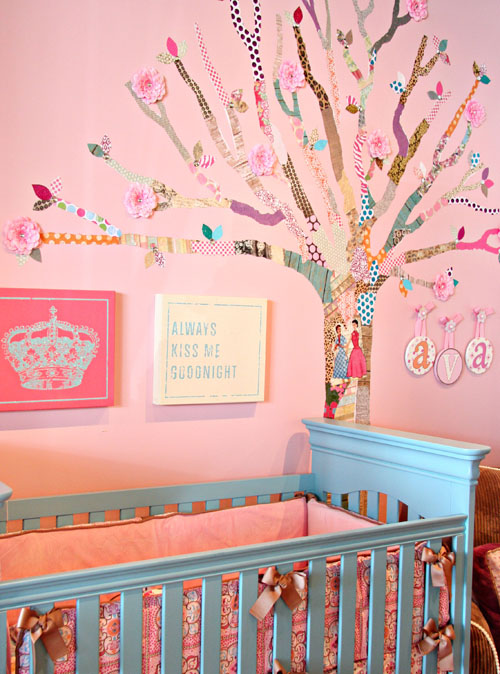 Une fois que l’arbre est assemblé au mur, ajoutez des fleurs et les feuilles découpées. Vous pouvez rajouter des strass aux fleurs et aux feuilles pour lui donner un coté clinquant, BLING !
