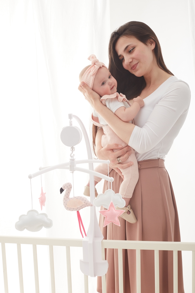Le mobile vous sera livré avec une potence adaptable à tous les lits à barreaux. Plus besoin de courir le dimanche matin chercher des piles lorsque le mobile ne fonctionne plus pour la sieste, il est équipé d’un mécanisme de remontée.