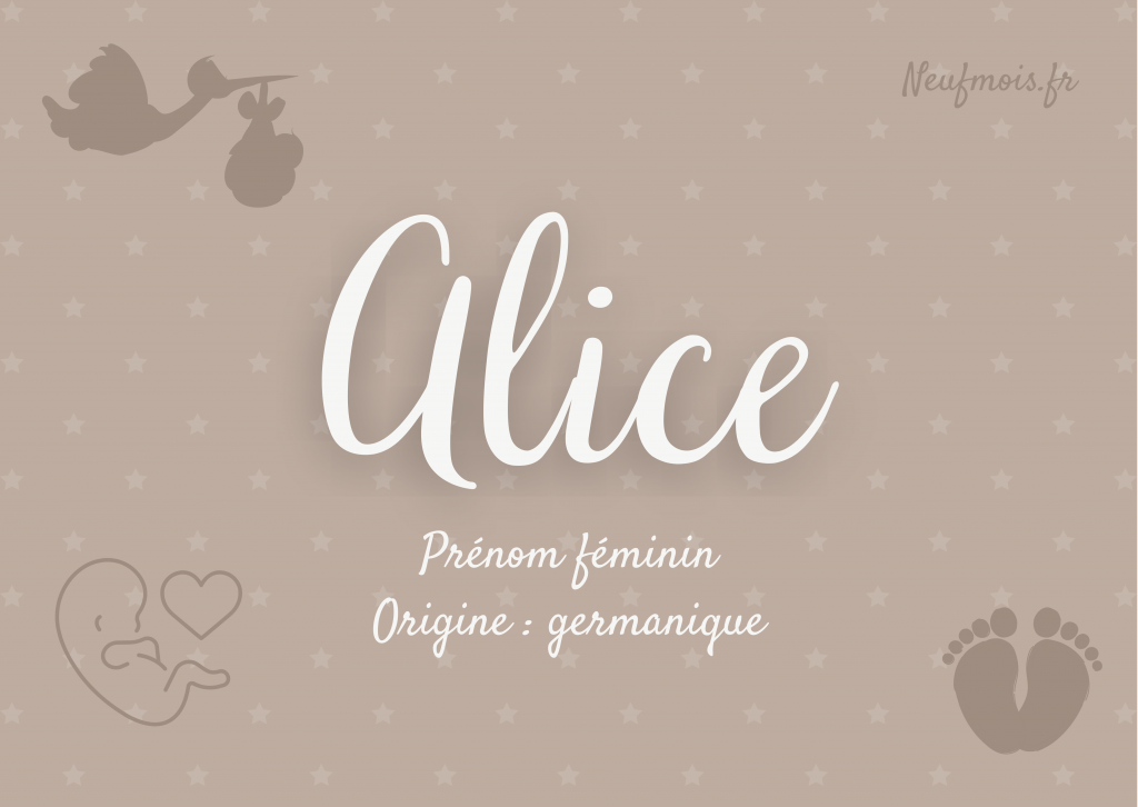Alice est un dérivé du prénom Adélaïde dont l’origine vient des mots germaniques « Adal » ou Noble, et « Héit » ou Lignée. Ces deux termes signifient « de noble lignée » ou « noble de race ». Comme Adélaïde, Alice est donc un prénom longtemps cantonné à la noblesse durant le Moyen Age. C’est en 1865, après le succès du roman de Lewis Carroll, Alice au Pays des Merveilles, qu’il s’est popularisé.